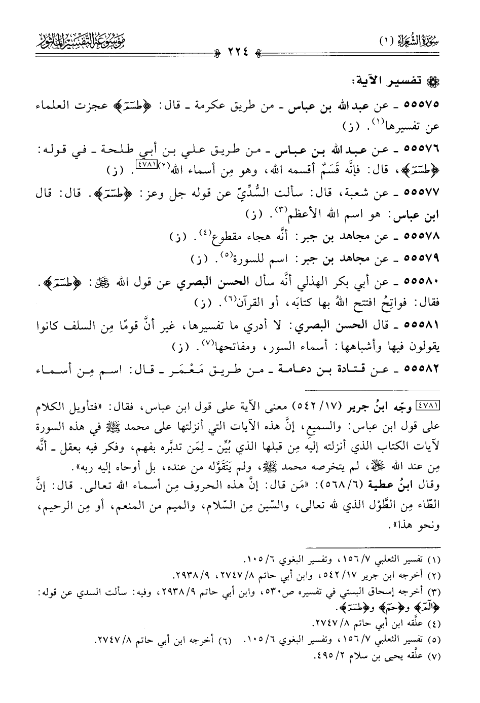 ٥٥٥٧٧ - عن شعبة، قال: سألت السُّدِّيّ عن قوله جل وعز: {طسم}. قال: قال ابن عباس: هو اسم الله الأعظم (¬٣). (ز)
