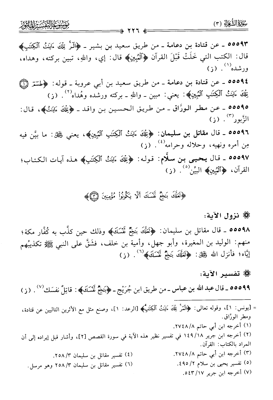 ٥٥٥٩٩ - قال عبد الله بن عباس -من طريق ابن جُرَيْج- {باخع نفسك}: قاتِلٌ نفسَك (¬٧). (ز)
