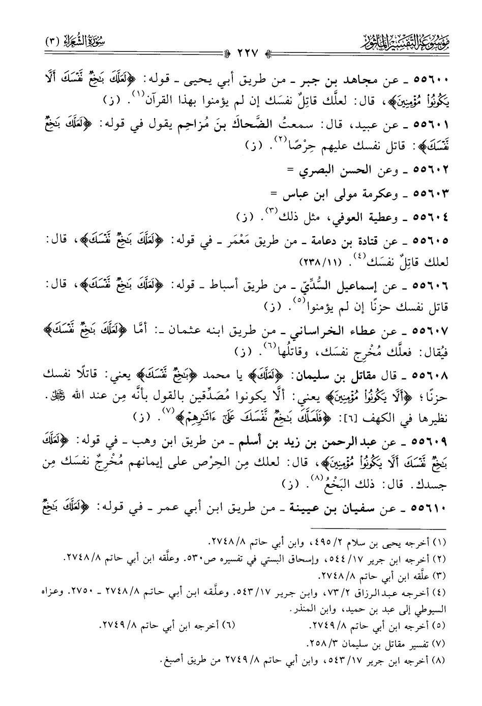 ٥٥٦٠٠ - عن مجاهد بن جبر -من طريق أبي يحيى- قوله: {لعلك باخع نفسك ألا يكونوا مؤمنين}، قال: لعلَّك قاتِلٌ نفسَك إن لم يؤمنوا بهذا القرآن (¬١). (ز)