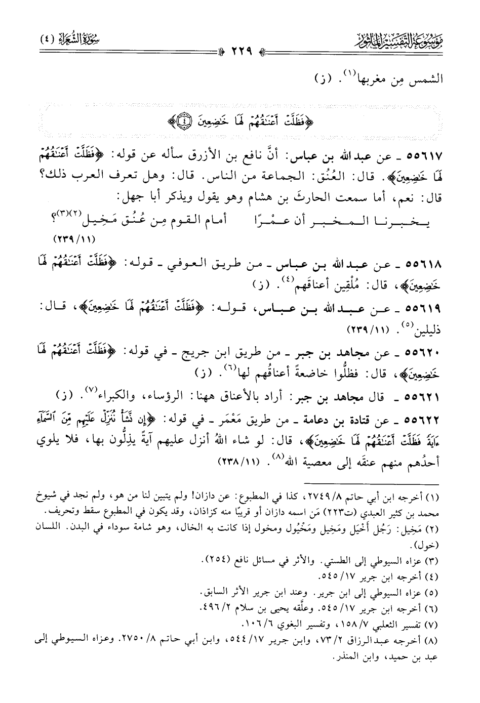 ٥٥٦١٧ - عن عبد الله بن عباس: أنّ نافع بن الأزرق سأله عن قوله: {فظلت أعناقهم لها خاضعين}. قال: العُنُق: الجماعة من الناس. قال: وهل تعرف العرب ذلك؟ قال: نعم، أما سمعت الحارثَ بن هشام وهو يقول ويذكر أبا جهل: