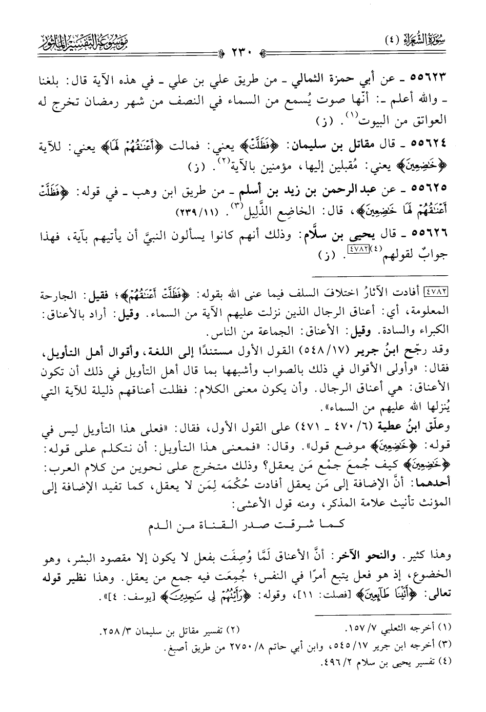 [٤٧٨٢] أفادت الآثارُ اختلافَ السلف فيما عنى الله بقوله: {فظلت أعناقهم}؛ فقيل: الجارحة المعلومة، أي: أعناق الرجال الذين نزلت عليهم الآية من السماء. وقيل: أراد بالأعناق: الكبراء والسادة. وقيل: الأعناق: الجماعة من الناس.