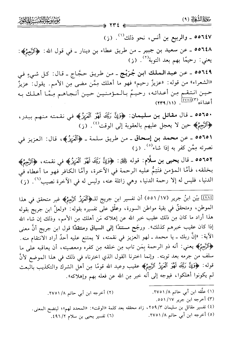 ٥٥٦٤٩ - عن عبد الملك ابن جُرَيْج -من طريق حجّاج- قال: كل شيءٍ في «الشعراء» من قوله: «عزيزٌ رحيم» فهو ما أهلك مِمَّن مضى مِن الأمم. يقول: عزيزٌ حين انتقم مِن أعدائه، رحيمٌ بالمؤمنين حين أنجاهم مِمّا أهلك به أعداءَه (¬٣) [٤٧٨٤]. (١١/ ٢٣٩)