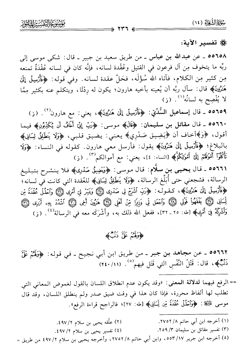 ٥٥٦٦٢ - عن مجاهد بن جبر -من طريق ابن أبي نجيح- في قوله: {ولهم علي ذنب}، قال: قَتْلُ النَّفْسِ التي قَتَل فيهم (¬٥). (١١/ ٢٤٠)