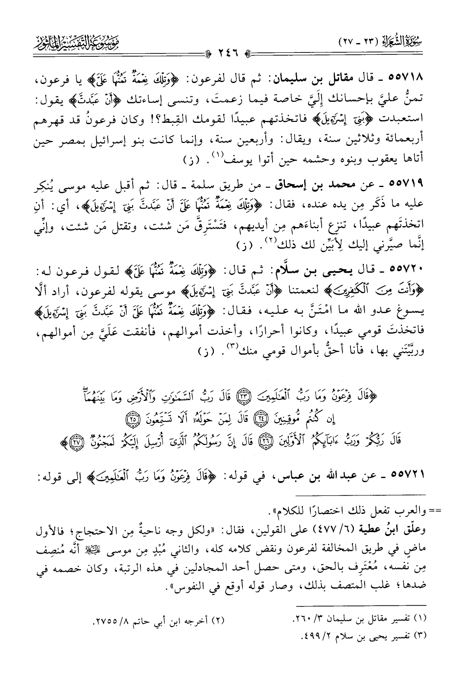 ٥٥٧٢٠ - قال يحيى بن سلّام: ثم قال: {وتلك نعمة تمنها علي} لقول فرعون له: {وأنت من الكافرين} لنعمتنا {أن عبدت بني إسرائيل} موسى يقوله لفرعون، أراد ألّا يسوغ عدو الله ما امْتَنَّ به عليه، فقال: {وتلك نعمة تمنها علي أن عبدت بني إسرائيل} فاتخذتَ قومي عبيدًا، وكانوا أحرارًا، وأخذت أموالهم، فأنفقت عَلَيَّ مِن أموالهم، وربَّيْتَني بها، فأنا أحقُّ بأموال قومي منك (¬٣). (ز)
