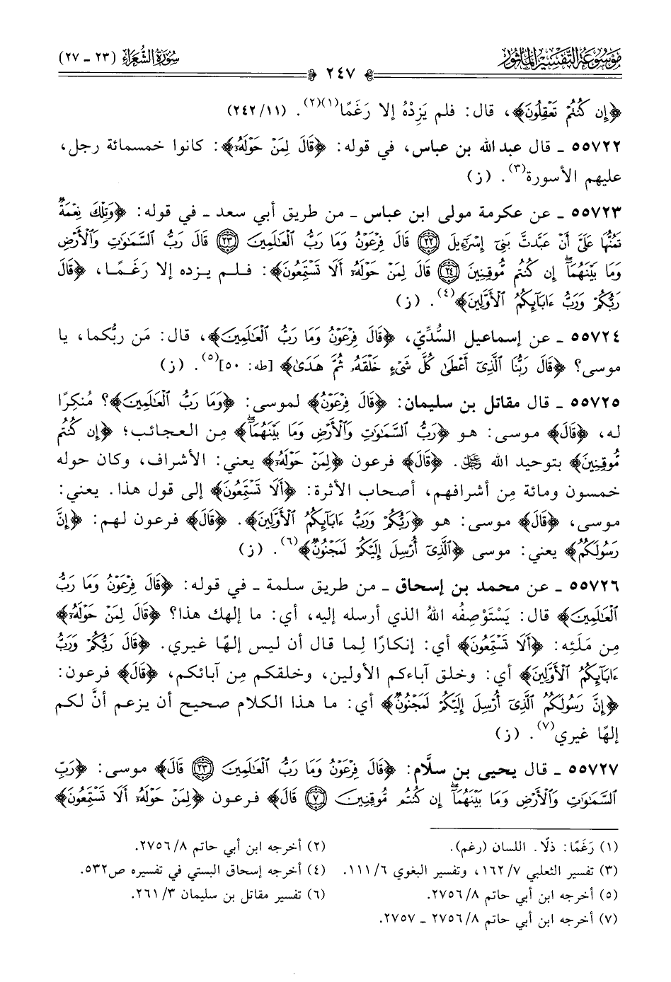 ٥٥٧٢٣ - عن عكرمة مولى ابن عباس -من طريق أبي سعد- في قوله: {وتلك نعمة تمنها عليَّ أن عبدت بني إسرائيل*قال فرعون وما رب العالمين*قال رب السموات والأرض وما بينهما إن كنتم موقنين*قال لمن حوله ألا تستمعون}: فلم يزده إلا رَغَمًا، {قال ربكم ورب آبائكم الأولين} (¬٤). (ز)