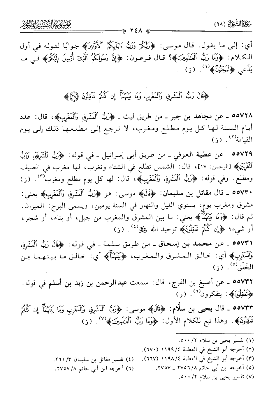٥٥٧٣٣ - قال يحيى بن سلّام: {قال} موسى: {رب المشرق والمغرب وما بينهما إن كنتم تعقلون}. وهذا تبع للكلام الأول: {وما رب العالمين} (¬٧). (ز)
