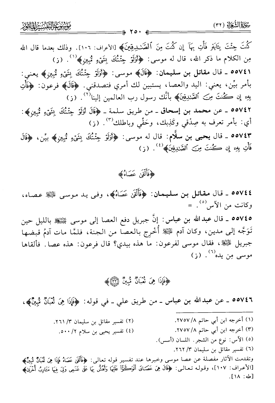 ٥٥٧٤٤ - قال مقاتل بن سليمان: {فألقى عصاه}، وفى يد موسى - عليه السلام - عصاه، وكانت من الآس (¬٥). =