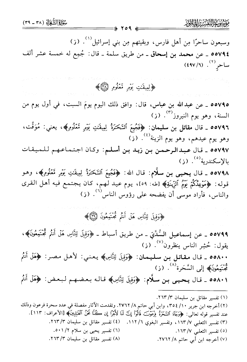 ٥٥٧٩٦ - قال مقاتل بن سليمان: {فجمع السحرة لميقات يوم معلوم}، يعني: مُوَقَّت، وهو يوم عيدهم، وهو يوم الزينة (¬٤). (ز)