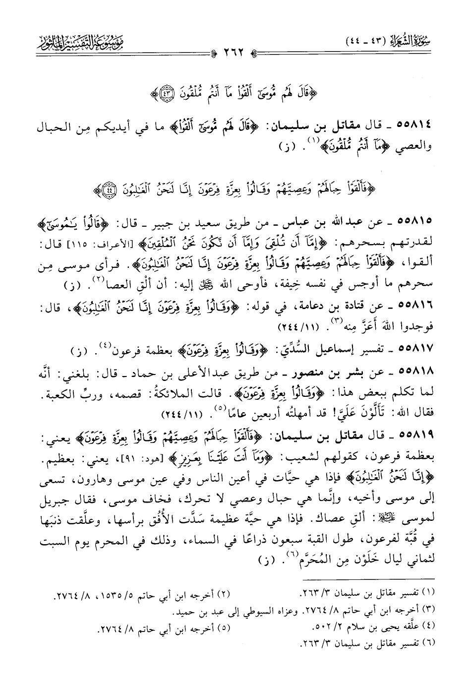 ٥٥٨١٥ - عن عبد الله بن عباس -من طريق سعيد بن جبير- قال: {قالوا يا موسى} لقدرتهم بسحرهم: {إما أن تلقي وإما أن نكون نحن الملقين} قال: ألقوا، {فَأَلْقَوْا حِبالَهُمْ وعِصِيَّهُمْ وقالُوا بِعِزَّةِ فِرْعَوْنَ إنّا لَنَحْنُ الغالِبُونَ}. فرأى موسى مِن سحرهم ما أوجس في نفسه خِيفة، فأوحى الله - عز وجل - إليه: أن ألْقِ العصا (¬٢). (ز)