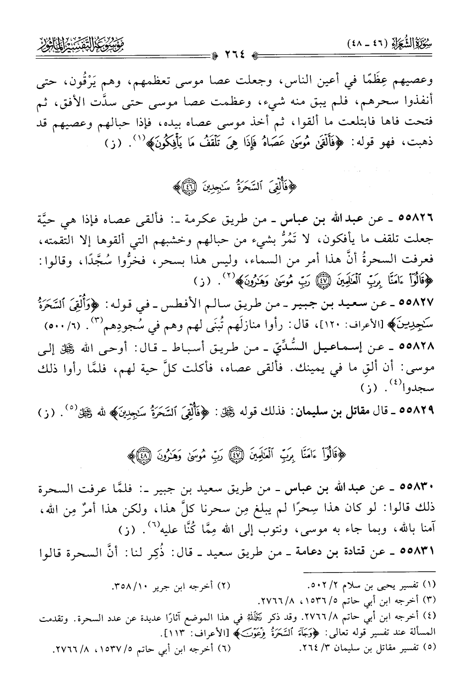 (¬٤) أخرجه ابن أبي حاتم ٨/ ٢٧٦٦. وقد ذكر? في هذا الموضع آثارًا عديدة عن عدد السحرة. وتقدمت المسألة عند تفسير قوله تعالى: {وجاءَ السَّحَرَةُ فِرْعَوْنَ} [الأعراف: ١١٣].