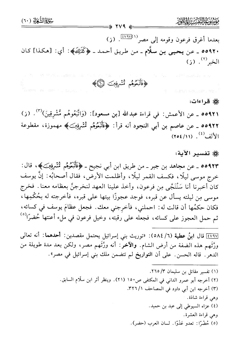 ٥٥٩٢١ - عن الأعمش: في قراءة عبد الله [بن مسعود]: (واتَّبَعُوهُم مُّشْرِقِينَ) (¬٣). (ز)