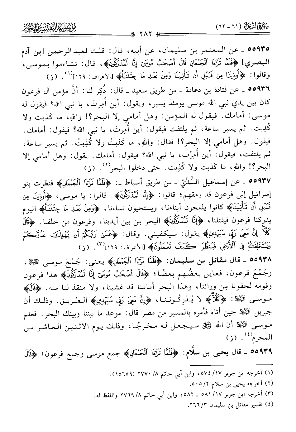 ٥٥٩٣٥ - عن المعتمر بن سليمان، عن أبيه، قال: قلت لعبد الرحمن [بن آدم البصري] {فلما تراءى الجمعان قال أصحاب موسى إنا لمدركون}، قال: تشاءموا بموسى، وقالوا: {أوذينا من قبل أن تأتينا ومن بعد ما جئتنا} [الأعراف: ١٢٩] (¬١). (ز)