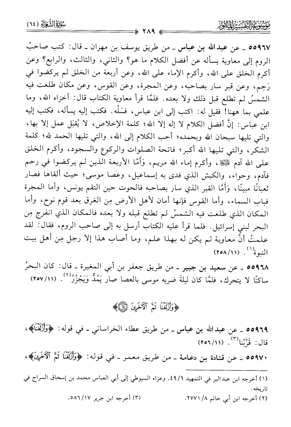 ٥٥٩٦٧ - عن عبد الله بن عباس -من طريق يوسف بن مهران- قال: كتب صاحبُ الروم إلى معاوية يسأله عن أفضل الكلام ما هو؟ والثاني، والثالث، والرابع؟ وعن أكرم الخلق على الله، وأكرم الإماء على الله، وعن أربعة من الخلق لم يركضوا في رَحِم، وعن قبر سار بصاحبه، وعن المجرة، وعن القوس، وعن مكان طلعت فيه الشمسُ لم تطلع قبل ذلك ولا بعده. فلمّا قرأ معاوية الكتاب قال: أخزاه الله، وما علمي بما ههنا! فقيل له: اكتب إلى ابن عباس، فسَلْه. فكتب إليه يسأله، فكتب إليه ابن عباس: إنّ أفضل الكلام لا إله إلا الله؛ كلمة الإخلاص، لا يُقبَل عمل إلا بها، والتي تليها سبحان الله وبحمده؛ أحب الكلام إلى الله، والتي تليها الحمد لله؛ كلمة الشكر، والتي تليها الله أكبر؛ فاتحة الصلوات والركوع والسجود، وأكرم الخلق على الله آدم - عليه السلام -، وأكرم إماء الله مريم، وأَمّا الأربعة الذين لم يركضوا في رحم فآدم، وحواء، والكبش الذي فدى به إسماعيل، وعصا موسى؛ حيث ألقاها فصار ثعبانًا مبينًا، وأَمّا القبر الذي سار بصاحبه فالحوت حين التقم يونس، وأما المجرة فباب السماء، وأما القوس فإنها أمان لأهل الأرض مِن الغرق بعد قوم نوح، وأما المكان الذي طلعت فيه الشمسُ لم تطلع قبله ولا بعده فالمكان الذي انفرج مِن البحر لبني إسرائيل. فلما قرأ عليه الكتاب أرسل به إلى صاحب الروم، فقال: لقد علمتُ أنّ معاوية لم يكن له بهذا علم، وما أصاب هذا إلا رجل مِن أهل بيت النبوة (¬١). (١١/ ٢٥٨)
