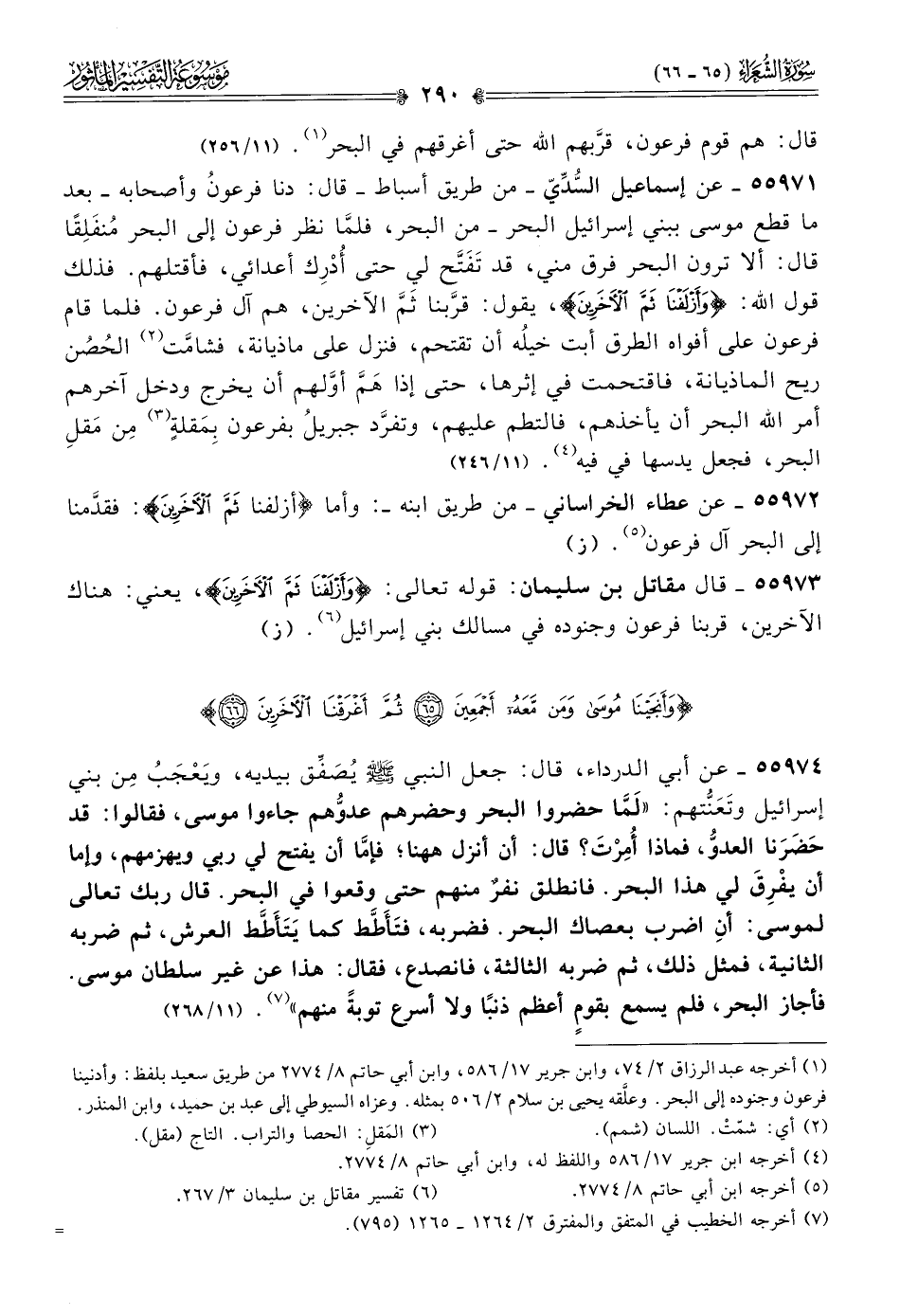 ٥٥٩٧١ - عن إسماعيل السُّدِّيّ -من طريق أسباط- قال: دنا فرعونُ وأصحابه -بعد ما قطع موسى ببني إسرائيل البحر- من البحر، فلمّا نظر فرعون إلى البحر مُنفَلِقًا قال: ألا ترون البحر فرق مني، قد تَفَتَّح لي حتى أُدْرِك أعدائي، فأقتلهم. فذلك قول الله: {وأزلفنا ثم الآخرين}، يقول: قرَّبنا ثَمَّ الآخرين، هم آل فرعون. فلما قام فرعون على أفواه الطرق أبت خيلُه أن تقتحم، فنزل على ماذيانة، فشامَّت (¬٢) الحُصُن ريح الماذيانة، فاقتحمت في إثرها، حتى إذا هَمَّ أوَّلهم أن يخرج ودخل آخرهم أمر الله البحر أن يأخذهم، فالتطم عليهم، وتفرَّد جبريلُ بفرعون بِمَقلةٍ (¬٣) مِن مَقلِ البحر، فجعل يدسها في فيه (¬٤). (١١/ ٢٤٦)