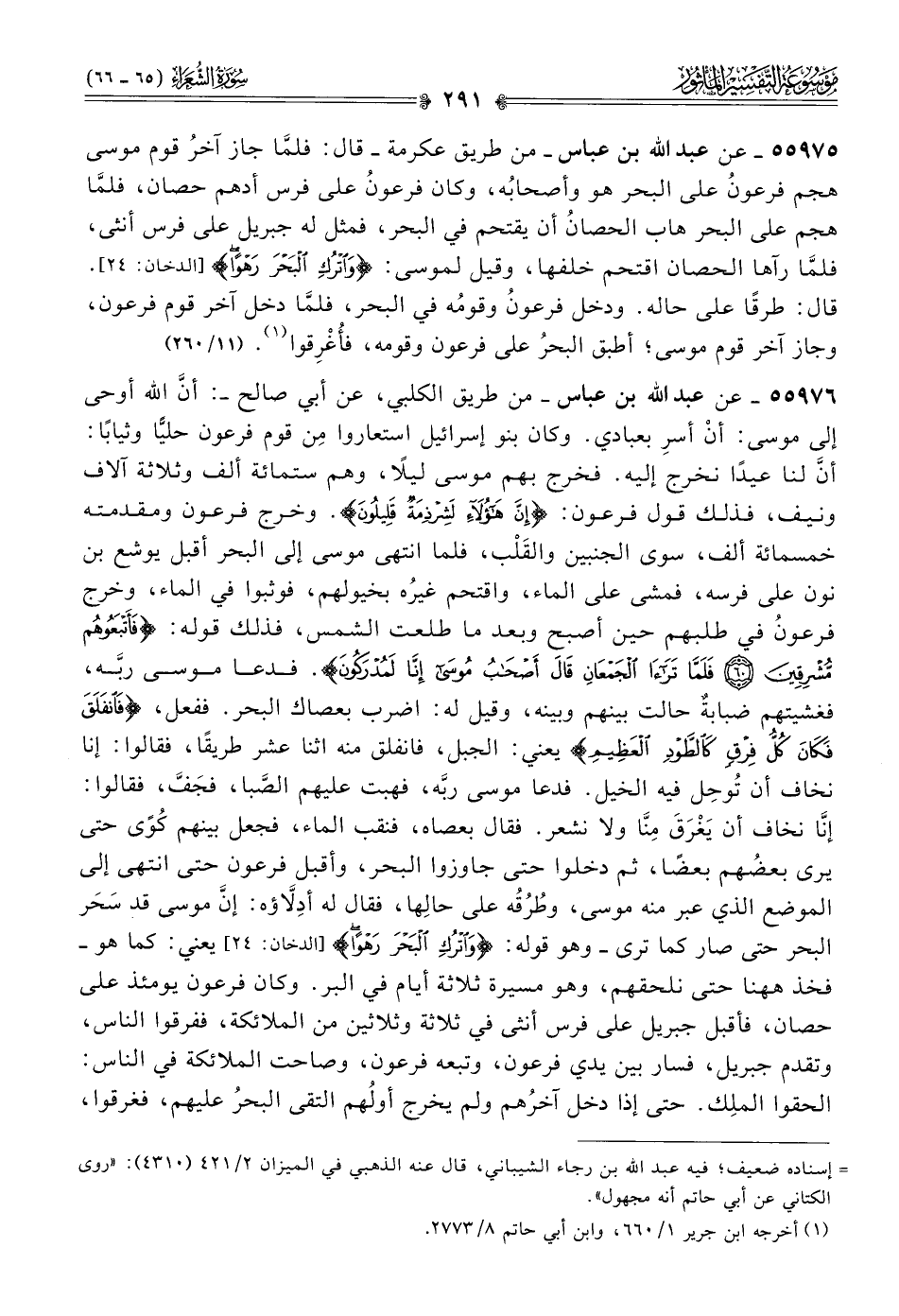 ٥٥٩٧٦ - عن عبد الله بن عباس -من طريق الكلبي، عن أبي صالح-: أنّ الله أوحى إلى موسى: أنْ أسرِ بعبادي. وكان بنو إسرائيل استعاروا مِن قوم فرعون حليًّا وثيابًا: أنّ لنا عيدًا نخرج إليه. فخرج بهم موسى ليلًا، وهم ستمائة ألف وثلاثة آلاف ونيف، فذلك قول فرعون: {إن هؤلاء لشرذمة قليلون}. وخرج فرعون ومقدمته خمسمائة ألف، سوى الجنبين والقَلْب، فلما انتهى موسى إلى البحر أقبل يوشع بن نون على فرسه، فمشى على الماء، واقتحم غيرُه بخيولهم، فوثبوا في الماء، وخرج فرعونُ في طلبهم حين أصبح وبعد ما طلعت الشمس، فذلك قوله: {فأتبعوهم مشرقين فلما تراءى الجمعان قال أصحاب موسى إنا لمدركون}. فدعا موسى ربَّه، فغشيتهم ضبابةٌ حالت بينهم وبينه، وقيل له: اضرب بعصاك البحر. ففعل، {فانفلق فكان كل فرق كالطود العظيم} يعني: الجبل، فانفلق منه اثنا عشر طريقًا، فقالوا: إنا نخاف أن تُوحِل فيه الخيل. فدعا موسى ربَّه، فهبت عليهم الصَّبا، فجَفَّ، فقالوا: إنّا نخاف أن يَغْرَقَ مِنّا ولا نشعر. فقال بعصاه، فنقب الماء، فجعل بينهم كُوًى حتى يرى بعضُهم بعضًا، ثم دخلوا حتى جاوزوا البحر، وأقبل فرعون حتى انتهى إلى الموضع الذي عبر منه موسى، وطُرُقُه على حالِها، فقال له أدِلّاؤه: إنّ موسى قد سَحَر البحر حتى صار كما ترى -وهو قوله: {واترك البحر رهوا} [الدخان: ٢٤] يعني: كما هو- فخذ ههنا حتى نلحقهم، وهو مسيرة ثلاثة أيام في البر. وكان فرعون يومئذ على حصان، فأقبل جبريل على فرس أنثى في ثلاثة وثلاثين من الملائكة، ففرقوا الناس، وتقدم جبريل، فسار بين يدي فرعون، وتبعه فرعون، وصاحت الملائكة في الناس: الحقوا الملِك. حتى إذا دخل آخرُهم ولم يخرج أولُهم التقى البحرُ عليهم، فغرقوا،