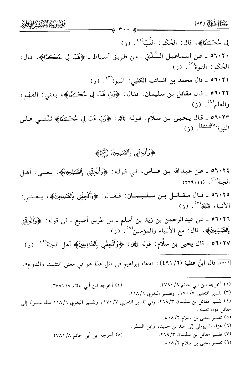 ٥٦٠٢٧ - قال يحيى بن سلّام: قوله - عز وجل -: {وألحقني بالصالحين} أهل الجنة (¬٩). (ز)