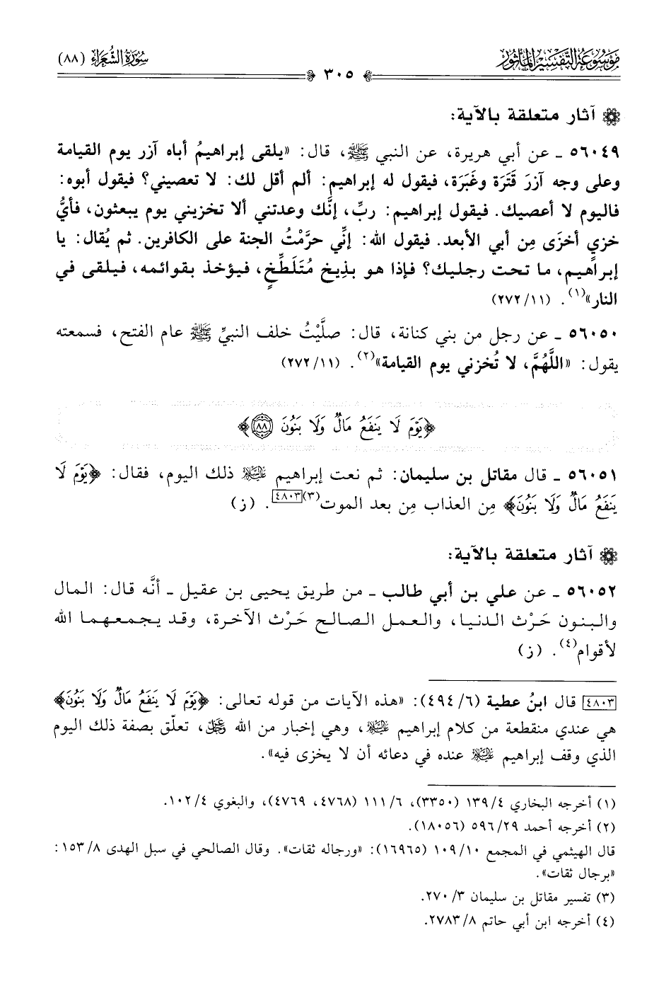 ٥٦٠٥١ - قال مقاتل بن سليمان: ثم نعت إبراهيم - عليه السلام - ذلك اليوم، فقال: {يوم لا ينفع مال ولا بنون} مِن العذاب مِن بعد الموت (¬٣) [٤٨٠٣]. (ز)