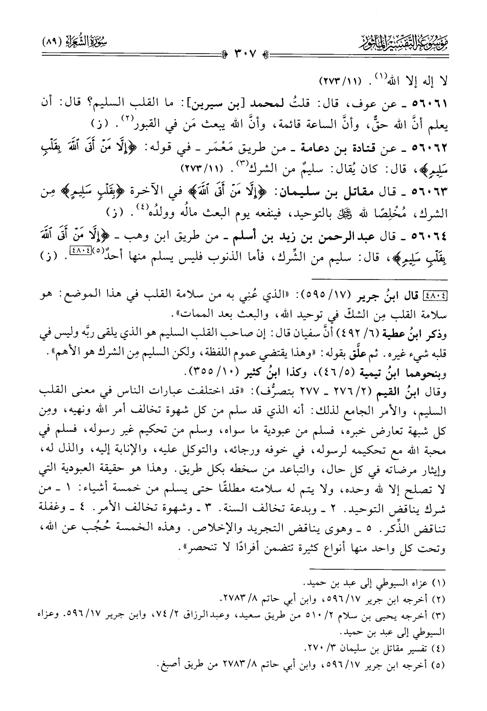 وذكر ابنُ عطية (٦/ ٤٩٢) أنّ سفيان قال: إن صاحب القلب السليم هو الذي يلقى ربَّه وليس في قلبه شيء غيره. ثم علَّق بقوله: «وهذا يقتضي عموم اللفظة، ولكن السليم مِن الشرك هو الأهم».