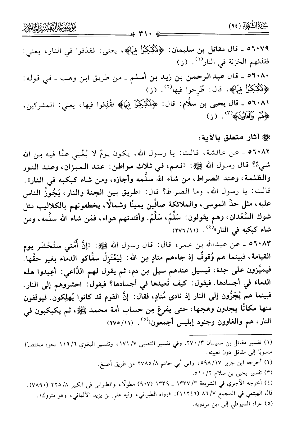 ٥٦٠٨٠ - قال عبد الرحمن بن زيد بن أسلم -من طريق ابن وهب- في قوله: {فكبكبوا فيها}، قال: طُرِحوا فيها (¬٢). (ز)