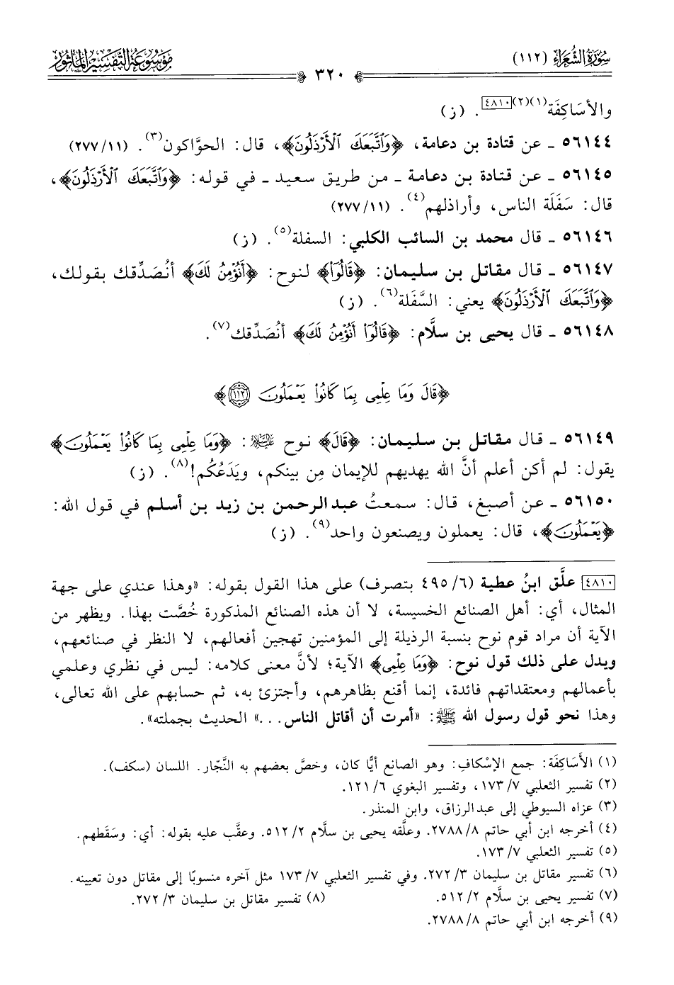 [٤٨١٠] علَّق ابنُ عطية (٦/ ٤٩٥ بتصرف) على هذا القول بقوله: «وهذا عندي على جهة المثال، أي: أهل الصنائع الخسيسة، لا أن هذه الصنائع المذكورة خُصَّت بهذا. ويظهر من الآية أن مراد قوم نوح بنسبة الرذيلة إلى المؤمنين تهجين أفعالهم، لا النظر في صنائعهم، ويدل على ذلك قول نوح: {ما عِلْمِي} الآية؛ لأنّ معنى كلامه: ليس في نظري وعلمي بأعمالهم ومعتقداتهم فائدة، إنما أقنع بظاهرهم، وأجتزئ به، ثم حسابهم على الله تعالى، وهذا نحو قول رسول الله - صلى الله عليه وسلم -: «أمرت أن أقاتل الناس ... » الحديث بجملته».