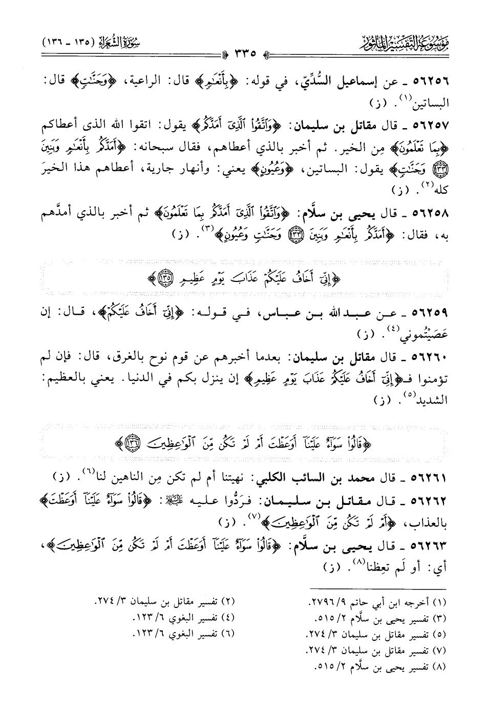 ٥٦٢٥٨ - قال يحيى بن سلّام: {واتقوا الذي أمدكم بما تعلمون} ثم أخبر بالذي أمدَّهم به، فقال: {أمدكم بأنعام وبنين (١٣٣) وجنات وعيون (١٣٤)} (¬٣). (ز)