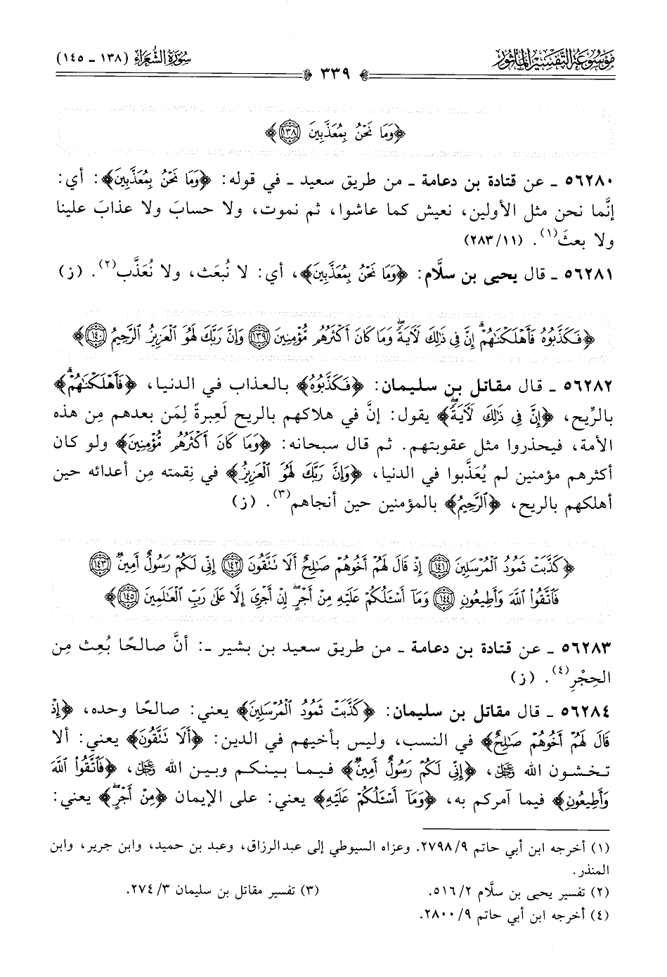 ٥٦٢٨٠ - عن قتادة بن دعامة -من طريق سعيد- في قوله: {وما نحن بمعذبين}: أي: إنّما نحن مثل الأولين، نعيش كما عاشوا، ثم نموت، ولا حسابَ ولا عذابَ علينا ولا بعثَ (¬١). (١١/ ٢٨٣)