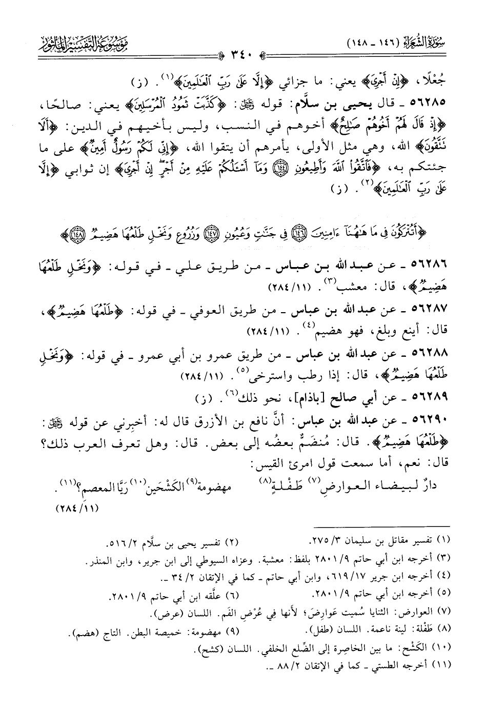 ٥٦٢٩٠ - عن عبد الله بن عباس: أنّ نافع بن الأزرق قال له: أخبِرني عن قوله - عز وجل -: {طلعها هضيم}. قال: مُنضَمٌّ بعضُه إلى بعض. قال: وهل تعرف العرب ذلك؟ قال: نعم، أما سمعت قول امرئ القيس: