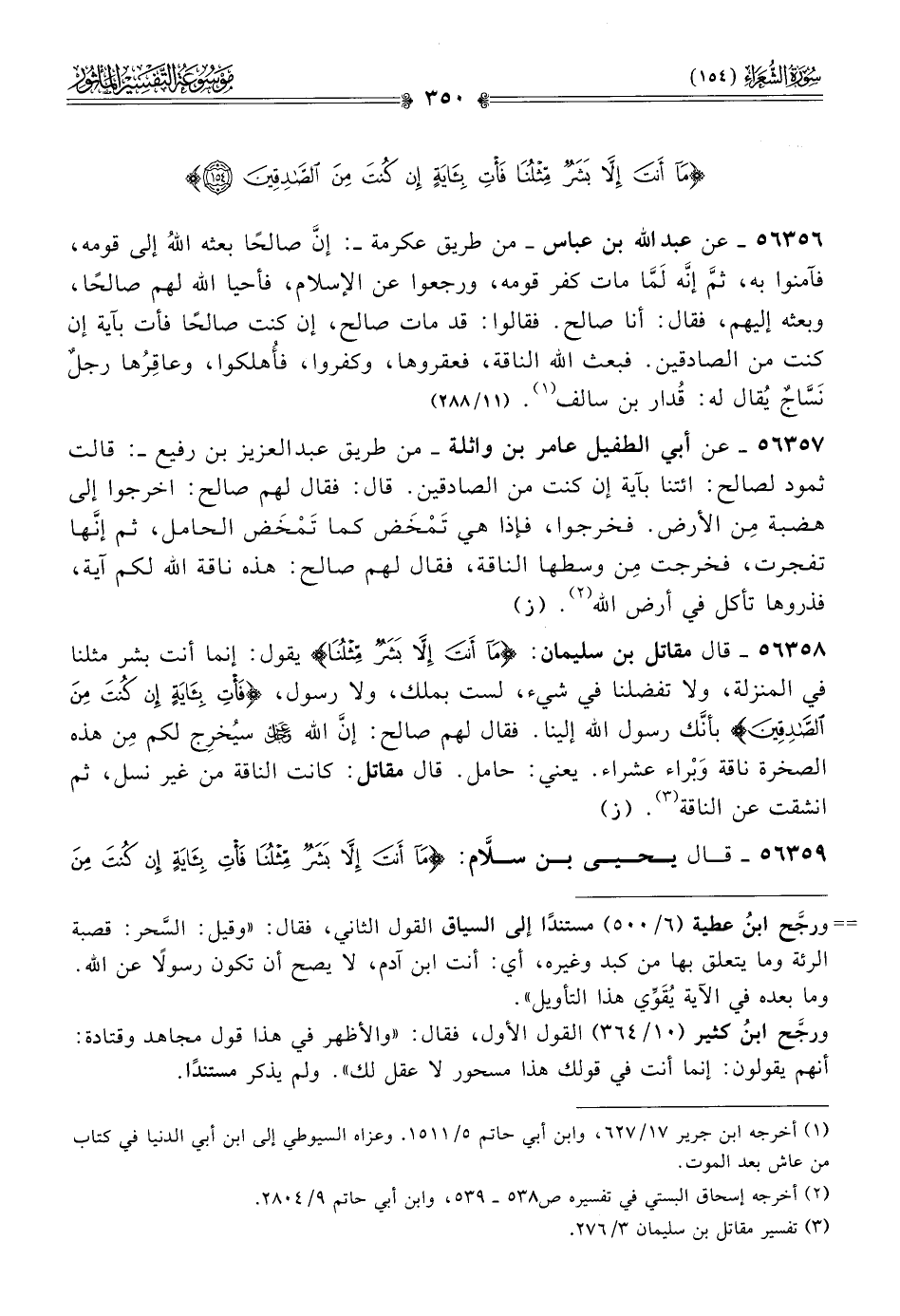 ٥٦٣٥٨ - قال مقاتل بن سليمان: {ما أنت إلا بشر مثلنا} يقول: إنما أنت بشر مثلنا في المنزلة، ولا تفضلنا في شيء، لست بملك، ولا رسول، {فأت بآية إن كنت من الصادقين} بأنّك رسول الله إلينا. فقال لهم صالح: إنّ الله - عز وجل - سيُخرِج لكم مِن هذه الصخرة ناقة وبْراء عشراء. يعني: حامل. قال مقاتل: كانت الناقة من غير نسل، ثم انشقت عن الناقة (¬٣). (ز)