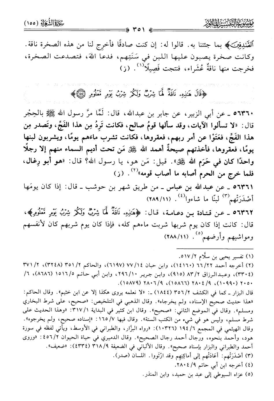 ٥٦٣٦٠ - عن أبي الزبير، عن جابر بن عبد الله، قال: لَمّا مرَّ رسول الله - صلى الله عليه وسلم - بالحِجْر قال: «لا تسألوا الآيات، وقد سألها قومُ صالح، فكانت تَرِدُ مِن هذا الفَجِّ، وتَصدر مِن هذا الفَجِّ، فعَتَوْا عن أمر ربهم، فعقروها، فكانت تشرب ماءَهم يومًا، ويشربون لبنها يومًا، فعقروها، فأخذتهم صيحةٌ أهمد الله - عز وجل - مَن تحت أديم السماء منهم إلا رجلًا واحدًا كان في حَرَم الله - عز وجل -». قيل: مَن هو، يا رسول الله؟ قال: «هو أبو رِغال، فلما خرج من الحرم أصابه ما أصاب قومه» (¬٢). (ز)