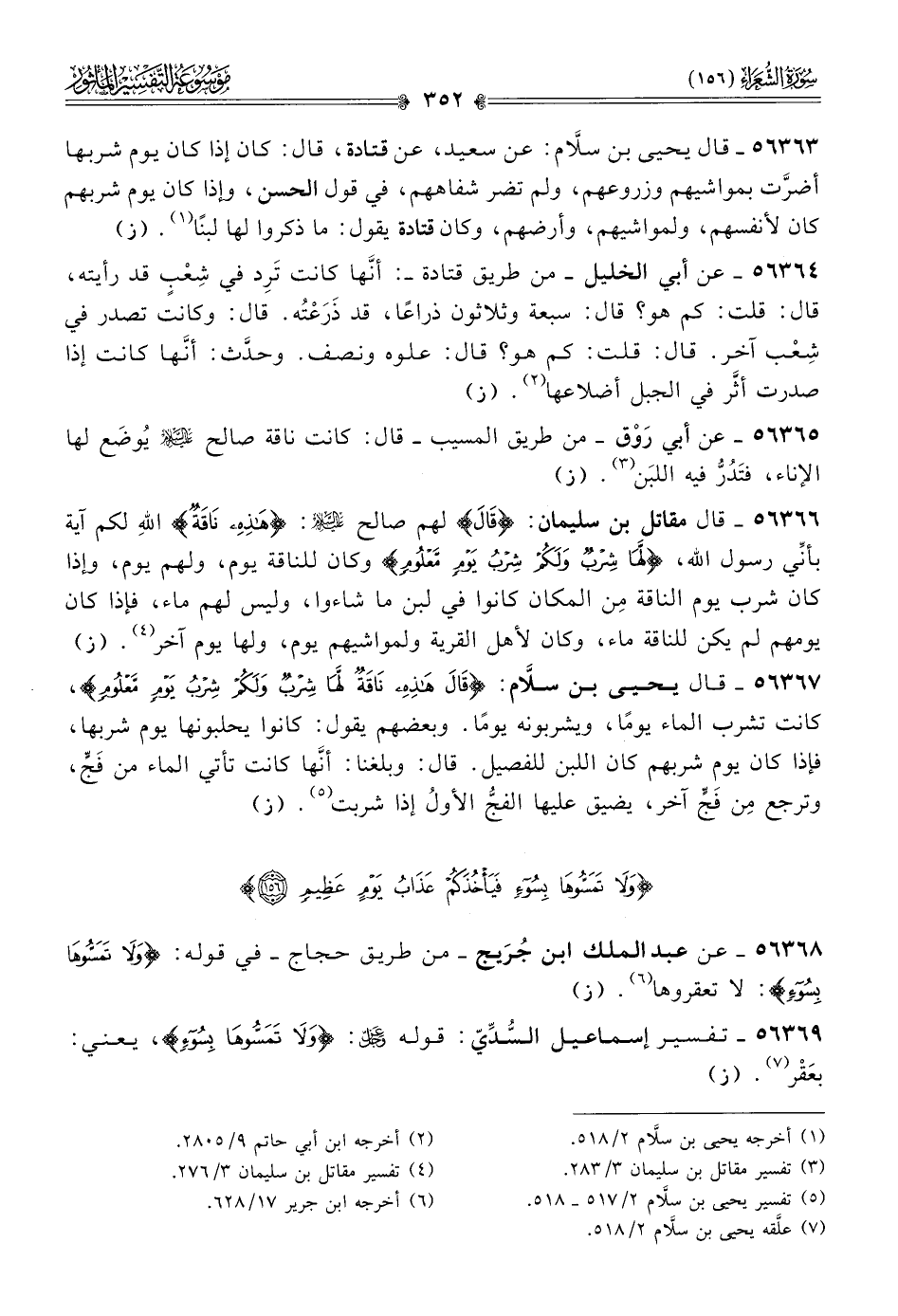 ٥٦٣٦٣ - قال يحيى بن سلّام: عن سعيد، عن قتادة، قال: كان إذا كان يوم شربها أضرَّت بمواشيهم وزروعهم، ولم تضر شفاههم، في قول الحسن، وإذا كان يوم شربهم كان لأنفسهم، ولمواشيهم، وأرضهم، وكان قتادة يقول: ما ذكروا لها لبنًا (¬١). (ز)