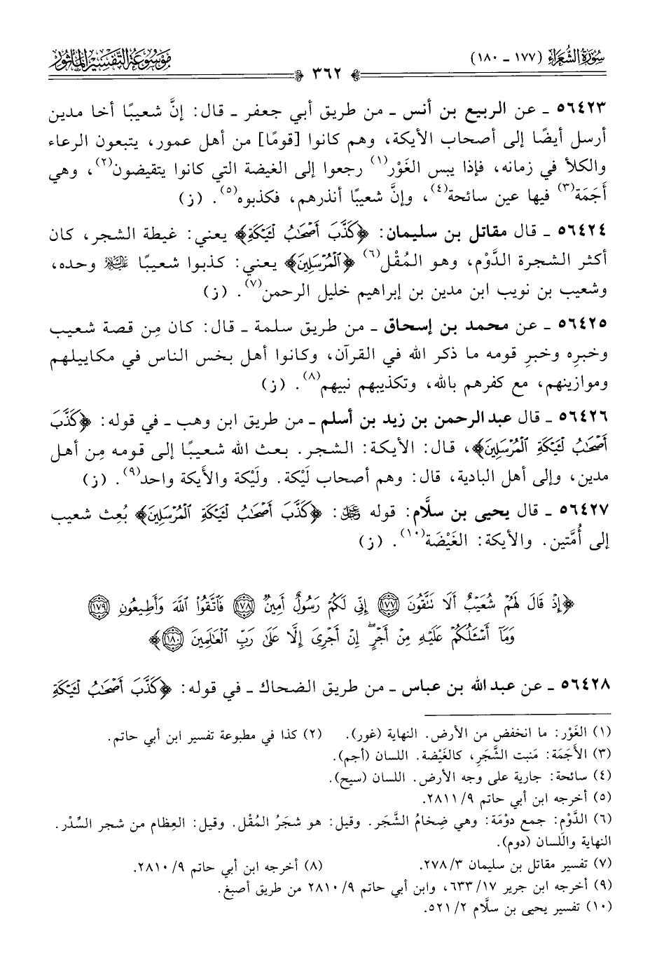 ٥٦٤٢٣ - عن الربيع بن أنس -من طريق أبي جعفر- قال: إنّ شعيبًا أخا مدين أرسل أيضًا إلى أصحاب الأيكة، وهم كانوا [قومًا] من أهل عمور، يتبعون الرعاء والكلأ في زمانه، فإذا يبس الغَوْر (¬١) رجعوا إلى الغيضة التي كانوا يتقيضون (¬٢)، وهي أجَمَة (¬٣) فيها عين سائحة (¬٤)، وإنّ شعيبًا أنذرهم، فكذبوه (¬٥). (ز)