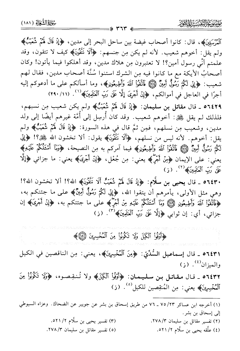 ٥٦٤٢٩ - قال مقاتل بن سليمان: {إذ قال لهم شعيب} ولم يكن شعيب مِن نسبهم، فلذلك لم يقل - عز وجل -: أخوهم شعيب. وقد كان أُرسِل إلى أُمَّة غيرهم أيضًا إلى ولد مدين، وشعيب مِن نسلهم، فمِن ثمَّ قال في هذه السورة: {إذ قال لهم شعيب} ولم يقل: أخوهم. لأنه ليس من نسلهم، {ألا تتقون} يقول: ألا تخشون الله - عز وجل -؟! {إني لكم رسول أمين*فاتقوا الله وأطيعون} فيما آمركم به مِن النصيحة، {وما أسألكم عليه} يعني: على الإيمان {من أجر} يعني: مِن جُعْل، {إن أجري} يعني: ما جزائي {إلا على رب العالمين} (¬٢). (ز)