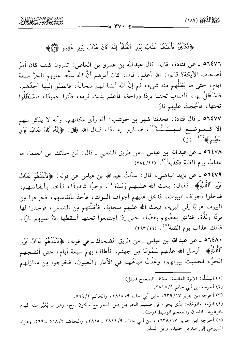 ٥٦٤٨٠ - عن عبد الله بن عباس -من طريق الضحاك- في قوله: {فأخذهم عذاب يوم الظلة}: أرسل الله عليهم سَمُومًا مِن جهنم، فأطاف بهم سبعة أيام، حتى أنضجهم الحرُّ، فحميت بيوتهم، وغَلَتْ مياهُهم في الآبار والعيون، فخرجوا مِن منازلهم