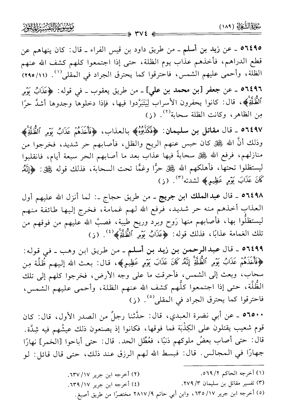 ٥٦٤٩٥ - عن زيد بن أسلم -من طريق داود بن قيس الفراء- قال: كان ينهاهم عن قطع الدراهم، فأخذهم عذاب يوم الظلة، حتى إذا اجتمعوا كلهم كشف الله عنهم الظلة، وأحمى عليهم الشمس، فاحترقوا كما يحترق الجراد في المقلى (¬١). (١١/ ٢٩٥)