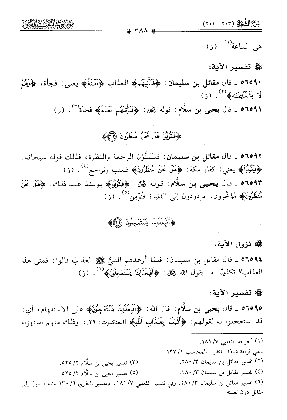 ٥٦٥٩٤ - قال مقاتل بن سليمان: فلمّا أوعدهم النبيُّ - صلى الله عليه وسلم - العذابَ قالوا: فمتى هذا العذاب؟ تكذيبًا به. يقول الله - عز وجل -: {أفبعذابنا يستعجلون} (¬٦). (ز)