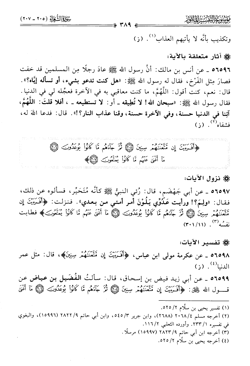 ٥٦٥٩٧ - عن أبي جَهْضَمٍ، قال: رُئي النبيُّ - صلى الله عليه وسلم - كأنّه مُتَحَيِّر، فسألوه عن ذلك، فقال: «ولِمَ؟! ورأيت عَدُوِّي يَلُونَ أمر أمتي من بعدي». فنزلت: {أفَرَأَيْتَ إنْ مَتَّعْناهُمْ سِنِينَ (٢٠٥) ثُمَّ جاءَهُمْ ما كانُوا يُوعَدُونَ (٢٠٦) ما أغْنى عَنْهُمْ ما كانُوا يُمَتَّعُونَ (٢٠٧)} فطابت نفسُه (¬٣). (١١/ ٣٠١)