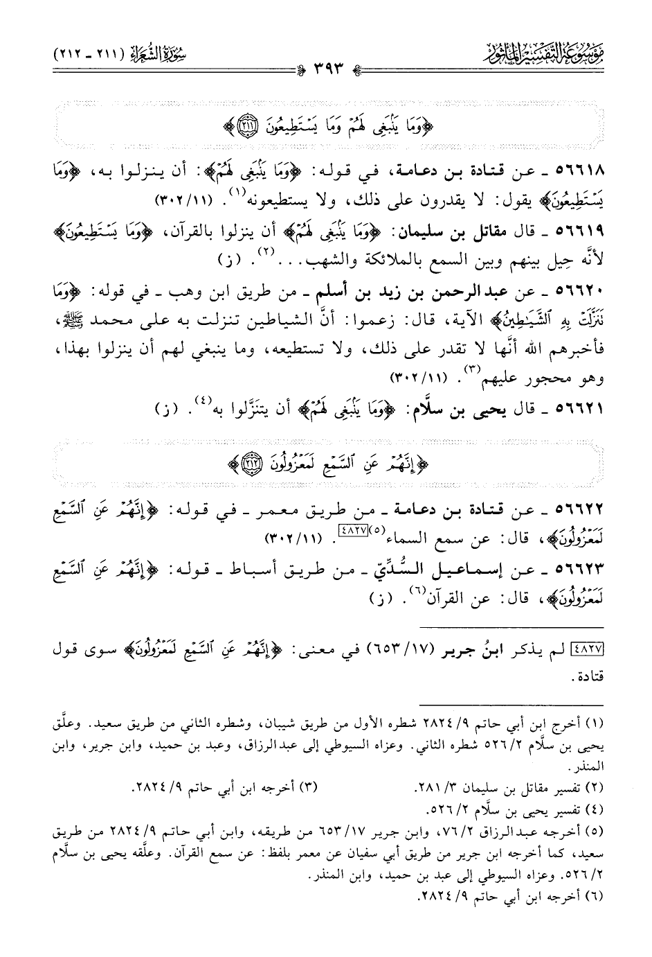 ٥٦٦٢٠ - عن عبد الرحمن بن زيد بن أسلم -من طريق ابن وهب- في قوله: {وما تنزلت به الشياطين} الآية، قال: زعموا: أنّ الشياطين تنزلت به على محمد - صلى الله عليه وسلم -، فأخبرهم الله أنّها لا تقدر على ذلك، ولا تستطيعه، وما ينبغي لهم أن ينزلوا بهذا، وهو محجور عليهم (¬٣). (١١/ ٣٠٢)