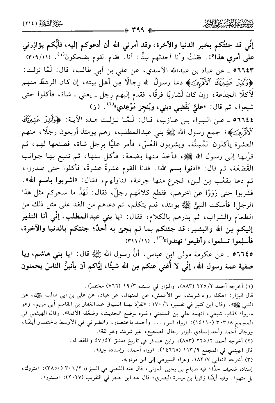 ٥٦٦٤٤ - عن البراء بن عازب، قال: لَمّا نزلت هذه الآية: {وأنذر عشيرتك الأقربين}؛ جمع رسول الله - صلى الله عليه وسلم - بني عبد المطلب، وهم يومئذ أربعون رجلًا، منهم العشرة يأكلون المُسِنَّة، ويشربون العُسّ، فأمر عليًّا برِجل شاة، فصنعها لهم، ثم قرَّبها إلى رسول الله - صلى الله عليه وسلم -، فأخذ منها بضعة، فأكل منها، ثم تتبع بها جوانب القَصْعَة، ثم قال: «ادنوا بسم الله». فدنا القوم عشرةً عشرةً، فأكلوا حتى صدروا، ثم دعا بقعْب مِن لبن، فجرع منها جرعة، فناولهم، فقال: «اشربوا باسم الله». فشربوا حتى رَوَوْا عن آخرهم، فقطع كلامَهم رجلٌ، فقال: لَهَدَّ ما سحركم مثل هذا الرجل! فأسكت النبيُّ - صلى الله عليه وسلم - يومئذ، فلم يتكلم، ثم دعاهم من الغد على مثل ذلك من الطعام والشراب، ثم بدرهم بالكلام، فقال: «يا بني عبد المطلب، إنِّي أنا النذير إليكم مِن الله والبشير، قد جئتكم بما لم يجئ به أحدٌ؛ جئتكم بالدنيا والآخرة، فأسلِموا تسلموا، وأطيعوا تهتدوا» (¬٣). (١١/ ٣١١)