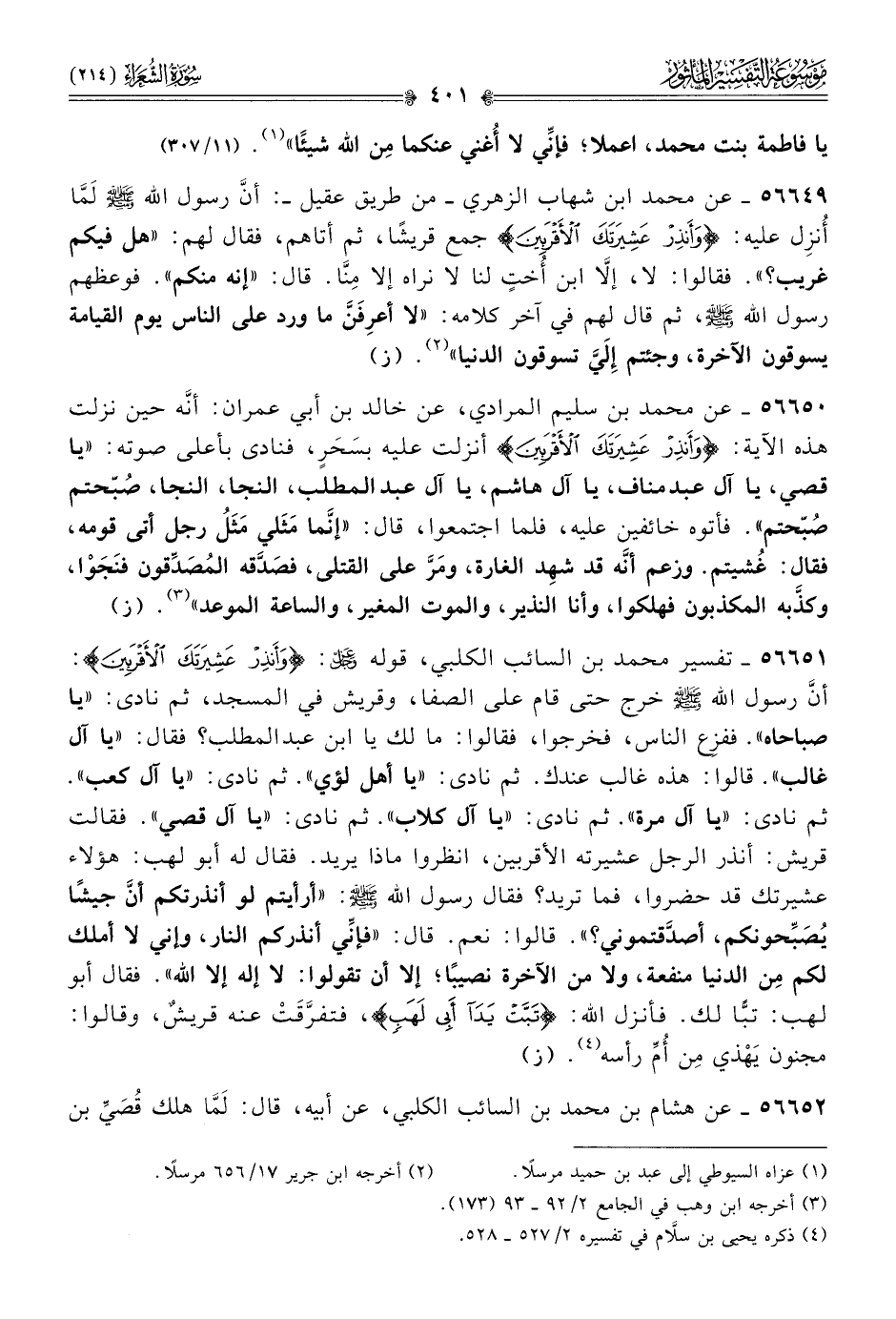 ٥٦٦٥١ - تفسير محمد بن السائب الكلبي، قوله - عز وجل -: {وأنذر عشيرتك الأقربين}: أنّ رسول الله - صلى الله عليه وسلم - خرج حتى قام على الصفا، وقريش في المسجد، ثم نادى: «يا صباحاه». ففزِع الناس، فخرجوا، فقالوا: ما لك يا ابن عبد المطلب؟ فقال: «يا آل غالب». قالوا: هذه غالب عندك. ثم نادى: «يا أهل لؤي». ثم نادى: «يا آل كعب». ثم نادى: «يا آل مرة». ثم نادى: «يا آل كلاب». ثم نادى: «يا آل قصي». فقالت قريش: أنذر الرجل عشيرته الأقربين، انظروا ماذا يريد. فقال له أبو لهب: هؤلاء عشيرتك قد حضروا، فما تريد؟ فقال رسول الله - صلى الله عليه وسلم -: «أرأيتم لو أنذرتكم أنّ جيشًا يُصَبِّحونكم، أصدَّقتموني؟». قالوا: نعم. قال: «فإنِّي أنذركم النار، وإني لا أملك لكم مِن الدنيا منفعة، ولا من الآخرة نصيبًا؛ إلا أن تقولوا: لا إله إلا الله». فقال أبو لهب: تبًّا لك. فأنزل الله: {تبت يدا أبي لهب}، فتفرَّقَتْ عنه قريشٌ، وقالوا: مجنون يَهْذي مِن أُمِّ رأسه (¬٤). (ز)