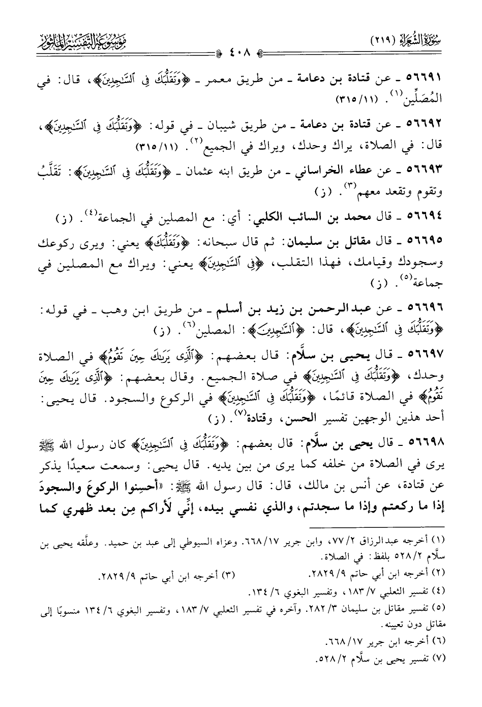 ٥٦٦٩٢ - عن قتادة بن دعامة -من طريق شيبان- في قوله: {وتقلبك في الساجدين}، قال: في الصلاة، يراك وحدك، ويراك في الجميع (¬٢). (١١/ ٣١٥)