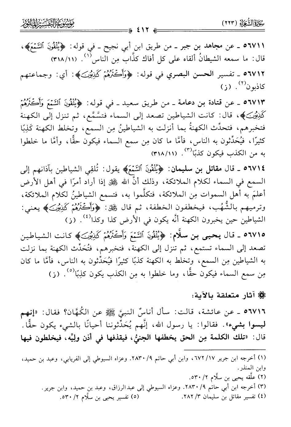 ٥٦٧١٣ - عن قتادة بن دعامة -من طريق سعيد- في قوله: {يلقون السمع وأكثرهم كاذبون}، قال: كانت الشياطين تصعد إلى السماء فتسَّمَّع، ثم تنزل إلى الكهنة فتخبرهم، فتحدِّث الكهنةُ بما أنزلت به الشياطينُ مِن السمع، وتخلط الكهنة كَذِبًا كثيرًا، فيُحَدِّثون به الناس، فأمّا ما كان مِن سمع السماء فيكون حقًّا، وأمّا ما خلطوا به من الكذب فيكون كذبًا (¬٣). (١١/ ٣١٨)