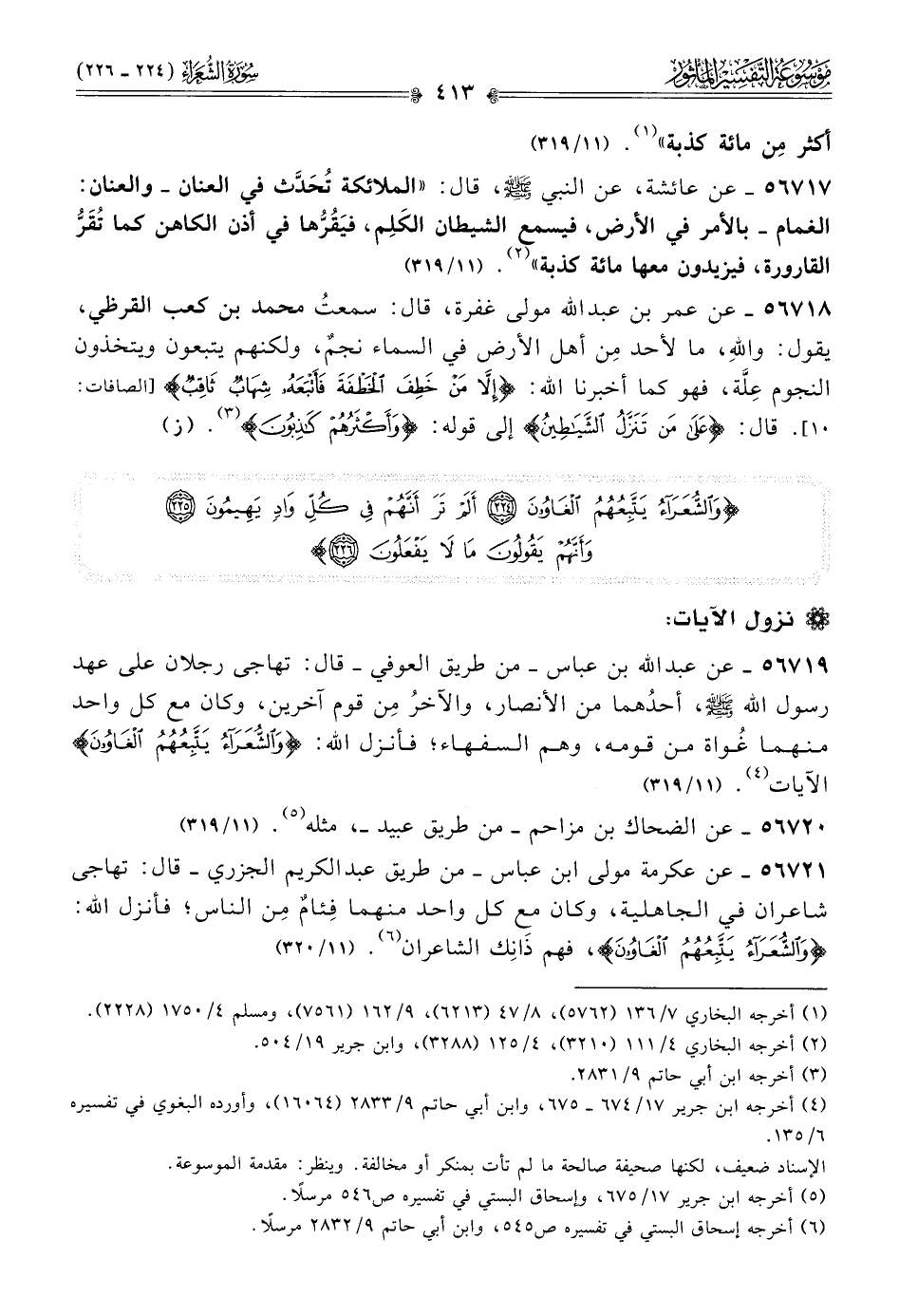 ٥٦٧١٩ - عن عبد الله بن عباس -من طريق العوفي- قال: تهاجى رجلان على عهد رسول الله - صلى الله عليه وسلم -، أحدُهما من الأنصار، والآخرُ مِن قوم آخرين، وكان مع كل واحد منهما غُواة من قومه، وهم السفهاء؛ فأنزل الله: {والشعراء يتبعهم الغاوون} الآيات (¬٤). (١١/ ٣١٩)