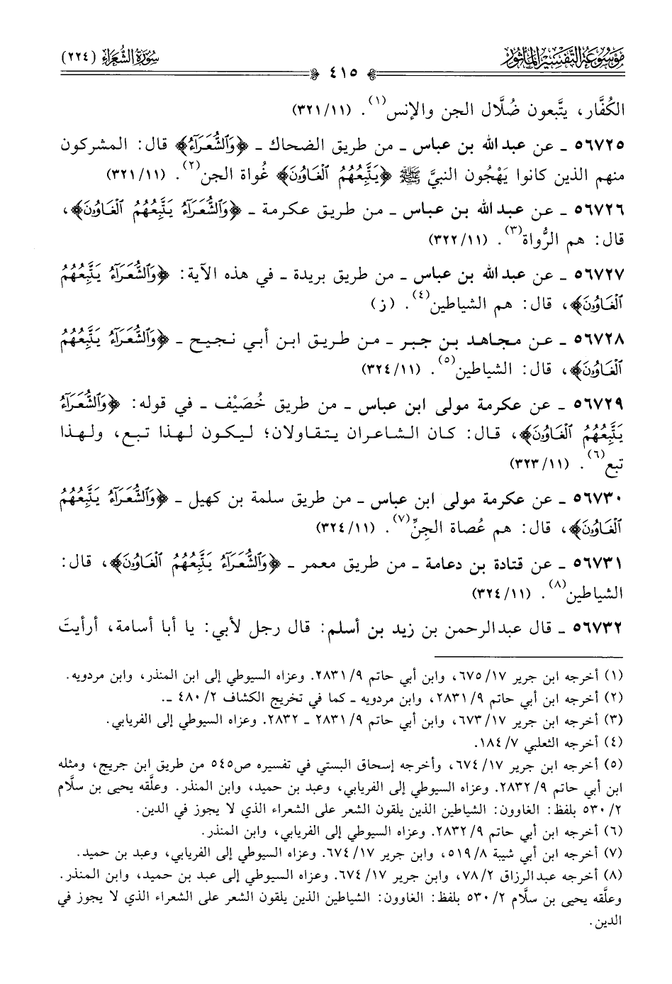 ٥٦٧٣٠ - عن عكرمة مولى ابن عباس -من طريق سلمة بن كهيل- {والشعراء يتبعهم الغاوون}، قال: هم عُصاة الجِنِّ (¬٧).