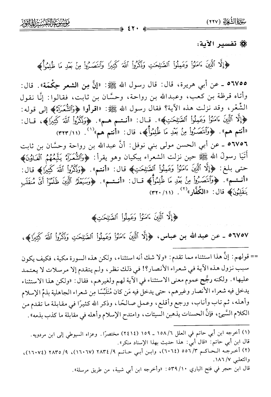 ٥٦٧٥٧ - عن عبد الله بن عباس، {إلا الذين آمنوا وعملوا الصالحات وذكروا الله كثيرا}،