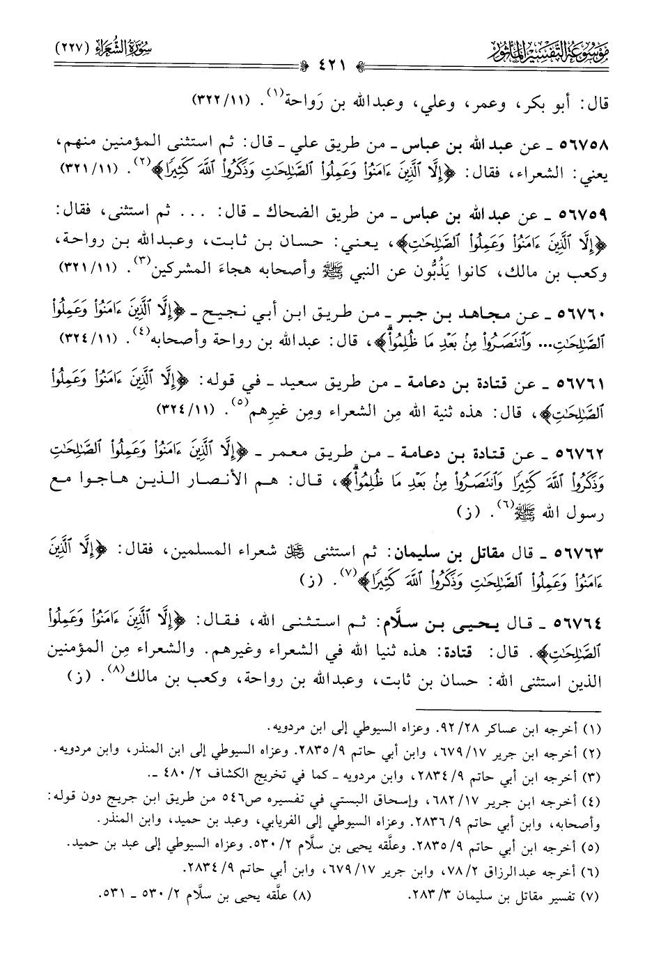 ٥٦٧٦٤ - قال يحيى بن سلّام: ثم استثنى الله، فقال: {إلا الذين آمنوا وعملوا الصالحات}. قال: قتادة: هذه ثنيا الله في الشعراء وغيرهم. والشعراء مِن المؤمنين الذين استثنى الله: حسان بن ثابت، وعبد الله بن رواحة، وكعب بن مالك (¬٨). (ز)