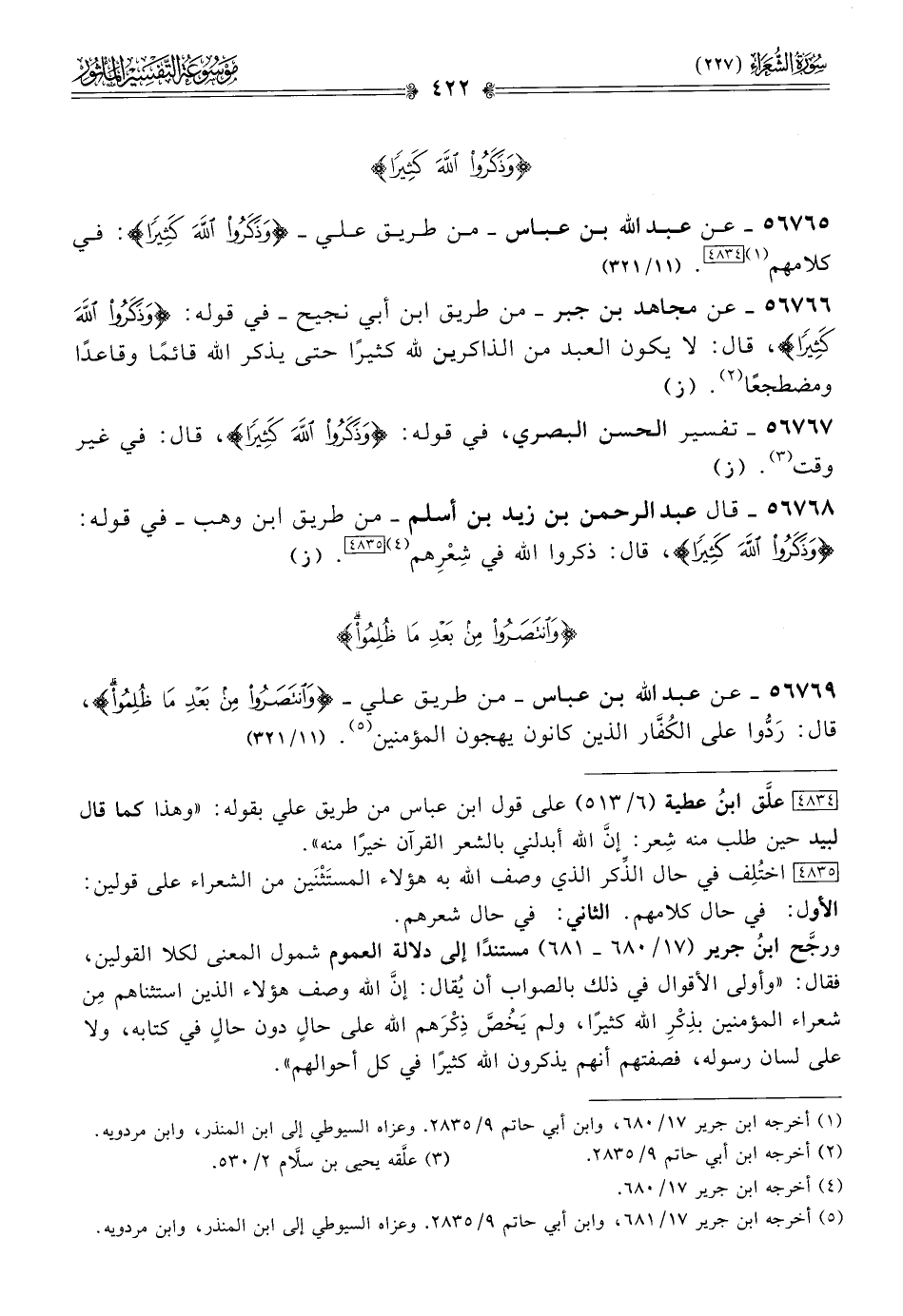 ٥٦٧٦٨ - قال عبد الرحمن بن زيد بن أسلم -من طريق ابن وهب- في قوله: {وذكروا الله كثيرا}، قال: ذكروا الله في شِعْرِهم (¬٤) [٤٨٣٥]. (ز)