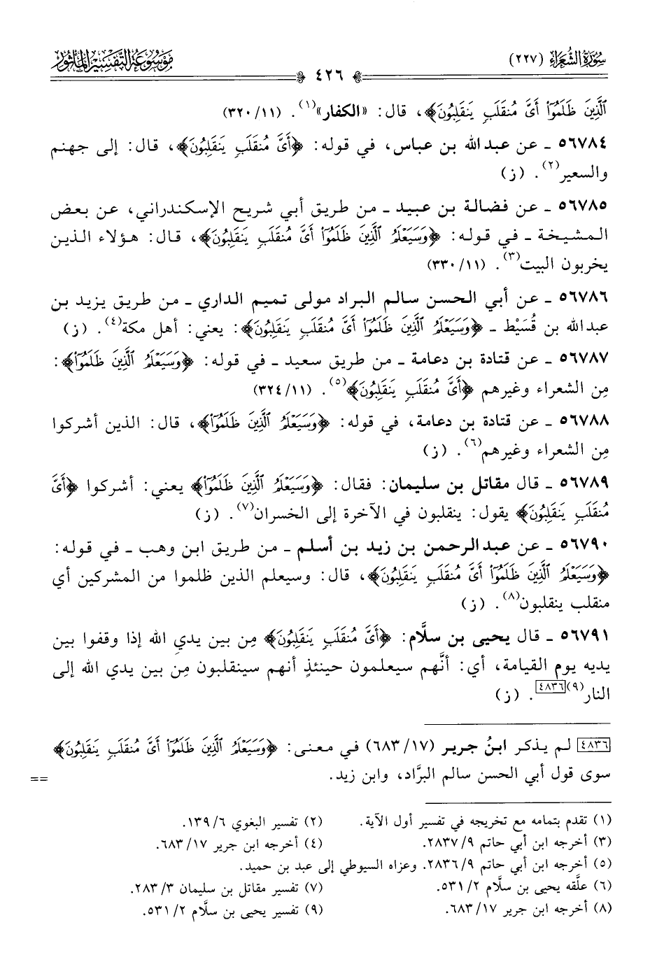 ٥٦٧٩٠ - عن عبد الرحمن بن زيد بن أسلم -من طريق ابن وهب- في قوله: {وسيعلم الذين ظلموا أي منقلب ينقلبون}، قال: وسيعلم الذين ظلموا من المشركين أي منقلب ينقلبون (¬٨). (ز)