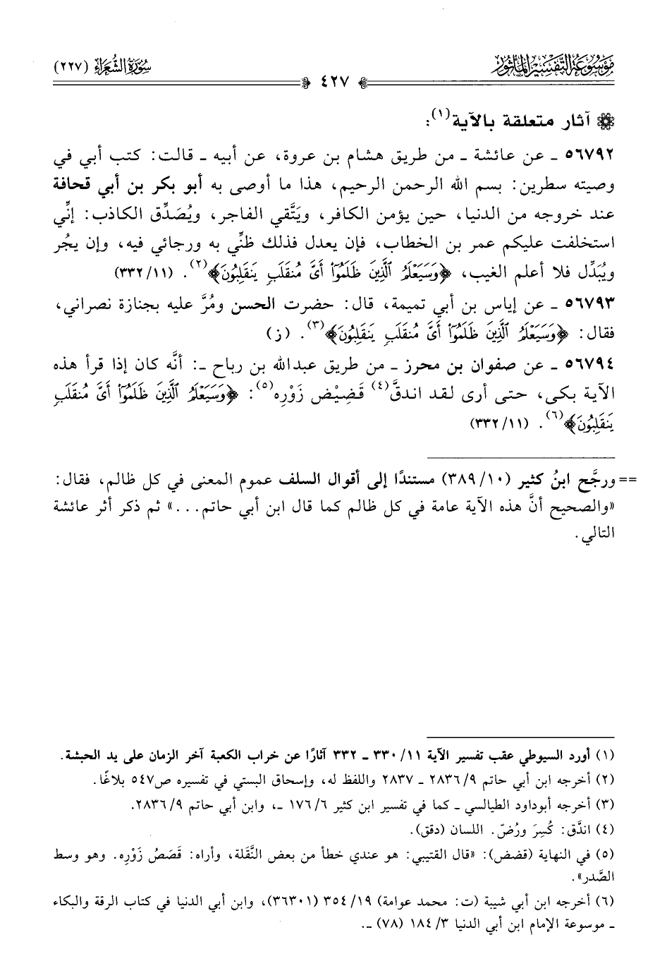 ٥٦٧٩٤ - عن صفوان بن محرز -من طريق عبد الله بن رباح-: أنّه كان إذا قرأ هذه الآية بكى، حتى أرى لقد اندقَّ (¬٤) قَضِيض زَوْرِه (¬٥): {وسيعلم الذين ظلموا أي منقلب ينقلبون} (¬٦). (١١/ ٣٣٢)