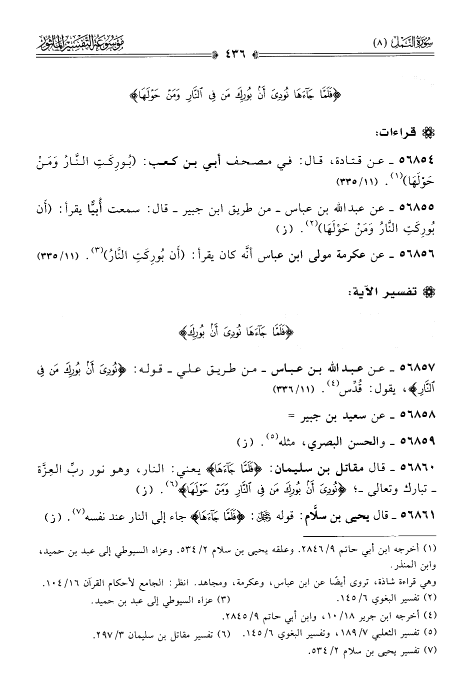 ٥٦٨٥٦ - عن عكرمة مولى ابن عباس أنّه كان يقرأ: (أن بُورِكَتِ النّارُ) (¬٣). (١١/ ٣٣٥)