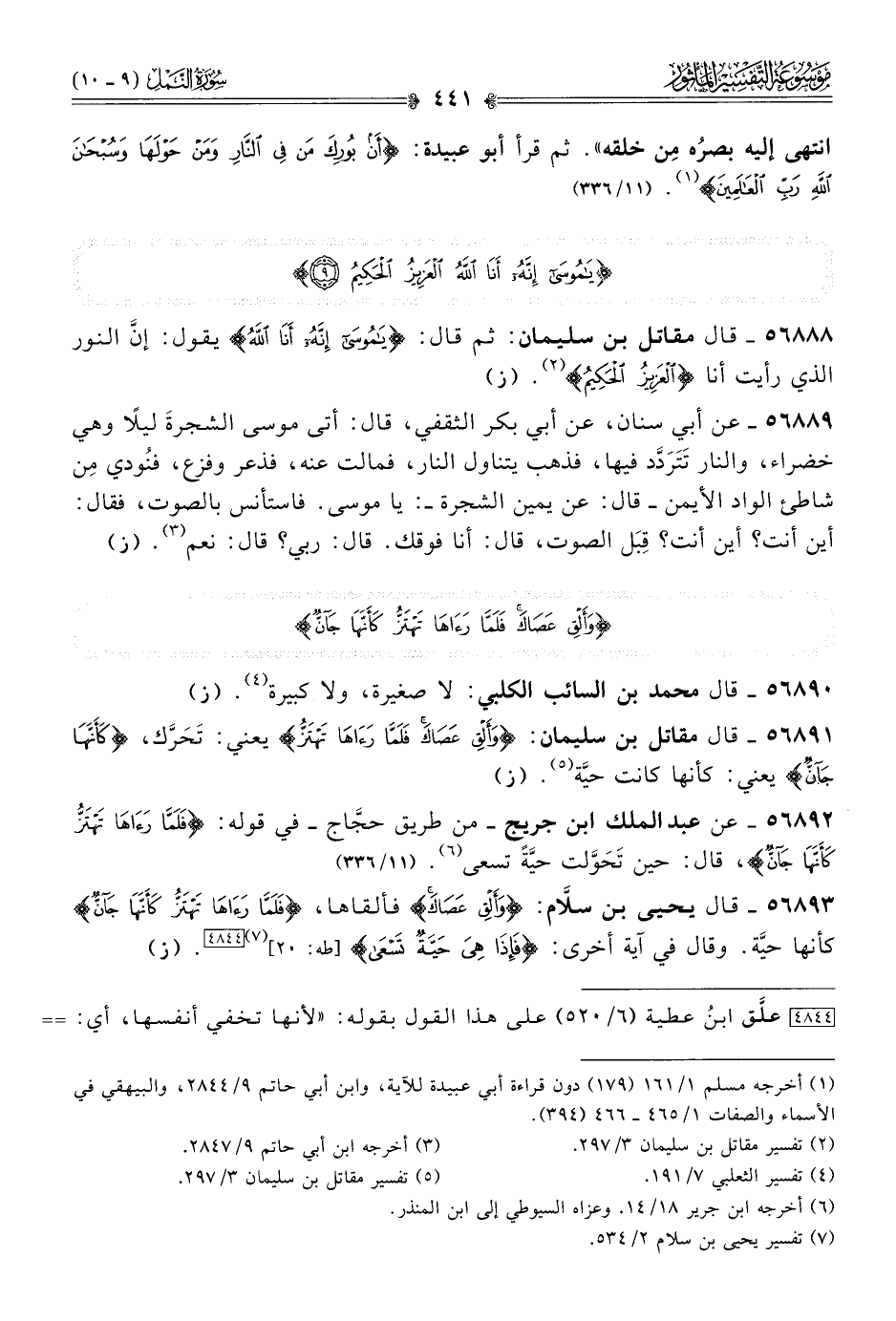 ٥٦٨٩٣ - قال يحيى بن سلّام: {وألق عصاك} فألقاها، {فلما رآها تهتز كأنها جان} كأنها حيَّة. وقال في آية أخرى: {فإذا هي حية تسعى} [طه: ٢٠] (¬٧) [٤٨٤٤]. (ز)